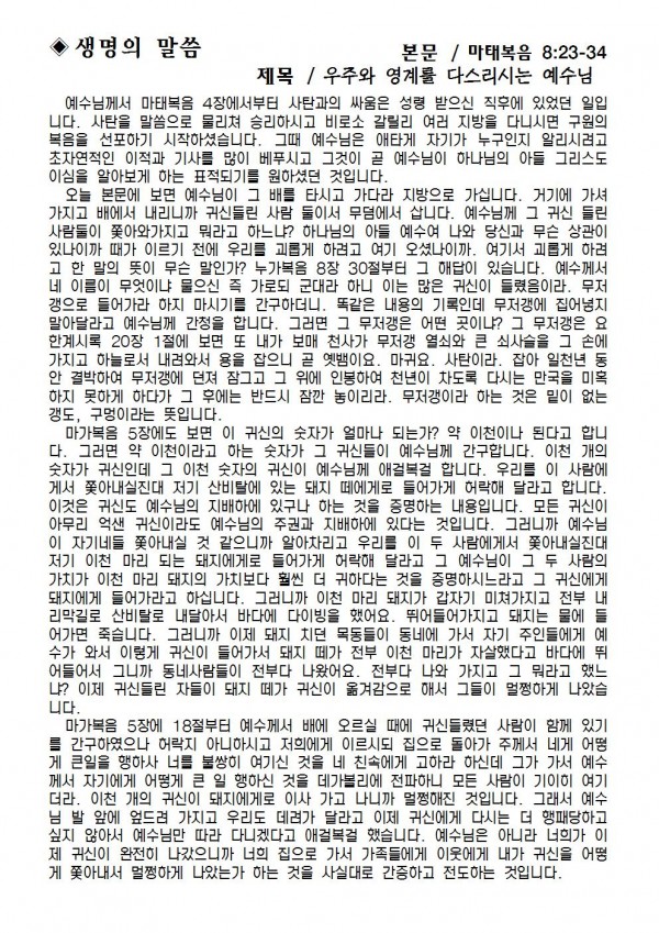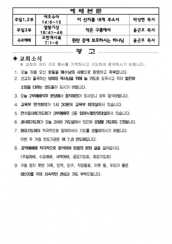2018 년 6월17일 예배본문 & 교회소식 페이지 정보 작성자 최고관리자 작성일18-06-15 15:01 조회7,885회 관련링크 이전글 다음글 목록 본문 2018 년 6월17일 예배본문 & 교회소식 이전글 다음글 목록