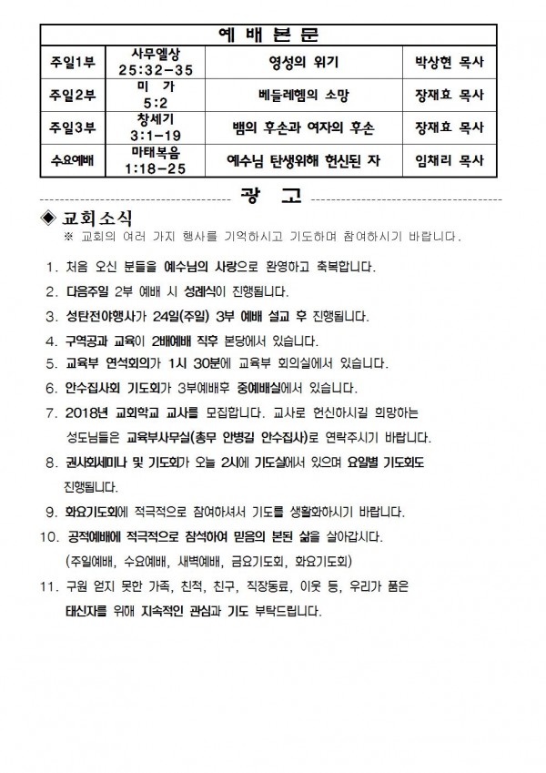 2017년 12월 17일 예배본문 & 교회소식 페이지 정보 작성자 최고관리자 작성일17-12-15 16:31 조회8,461회 관련링크 이전글 다음글 목록 본문 2017년 12월 17일 예배본문 & 교회소식 이전글 다음글 목록