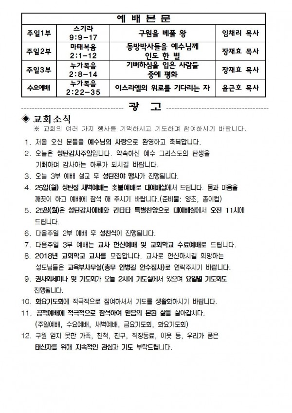 2017년 12월 24일 예배본문 & 교회소식 페이지 정보 작성자 최고관리자 작성일17-12-22 14:48 조회8,539회 관련링크 이전글 다음글 목록 본문 2017년 12월 24일 예배본문 & 교회소식 이전글 다음글 목록