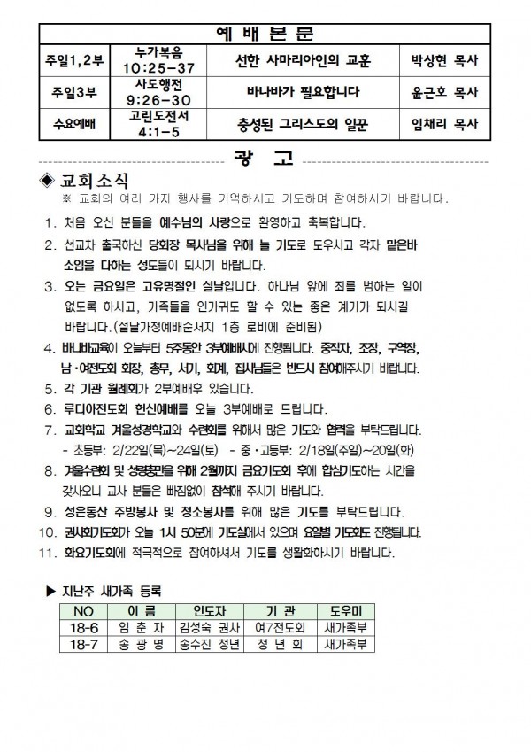 2018 년 2월 11일 예배본문 & 교회소식 페이지 정보 작성자 최고관리자 작성일18-02-09 16:57 조회8,297회 관련링크 이전글 다음글 목록 본문 2018 년 2월 11일 예배본문 & 교회소식 이전글 다음글 목록