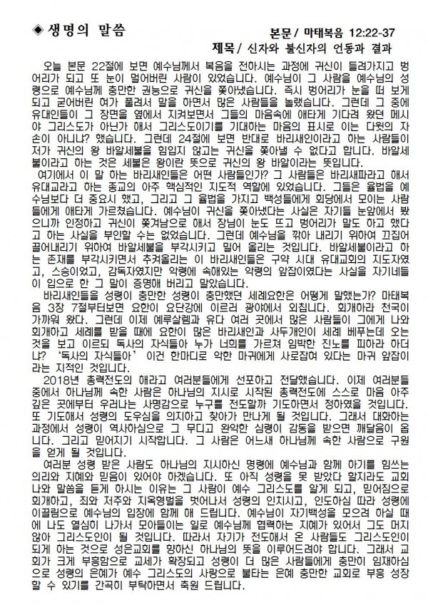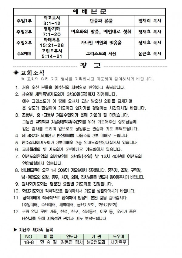 2018 년 2월 25일 예배본문 & 교회소식 페이지 정보 작성자 최고관리자 작성일18-02-23 14:11 조회8,256회 관련링크 이전글 다음글 목록 본문 2018 년 2월 25일 예배본문 & 교회소식 이전글 다음글 목록