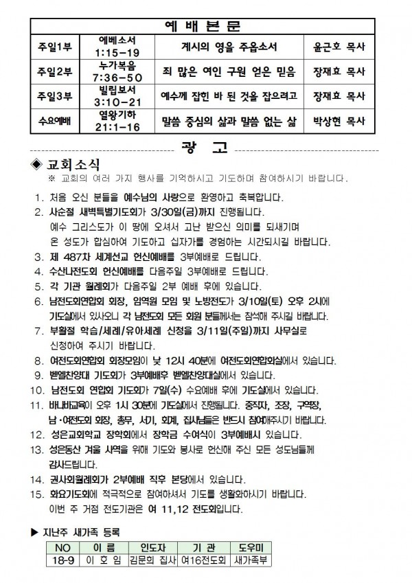 2018 년 3월 4일 예배본문 & 교회소식 페이지 정보 작성자 최고관리자 작성일18-03-02 16:50 조회8,198회 관련링크 이전글 다음글 목록 본문 2018 년 3월 4일 예배본문 & 교회소식 이전글 다음글 목록
