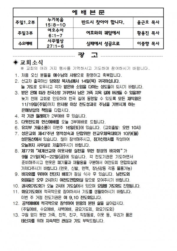 2017년 9월 10일 예배본문 & 교회소식 페이지 정보 작성자 최고관리자 작성일17-09-07 16:30 조회9,518회 관련링크 이전글 다음글 목록 본문 2017년 9월 10일 예배본문 & 교회소식 이전글 다음글 목록