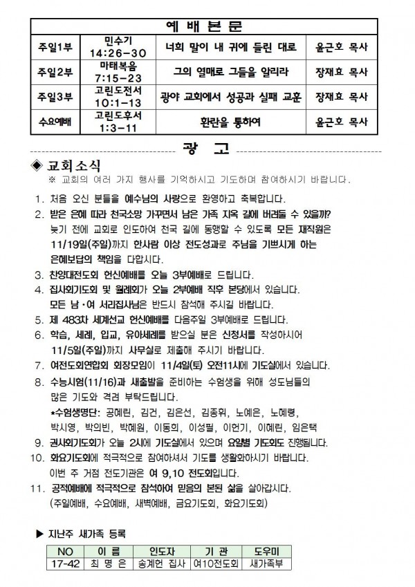 2017년 10월 29일 예배본문 & 교회소식 페이지 정보 작성자 최고관리자 작성일17-10-27 16:28 조회8,677회 관련링크 이전글 다음글 목록 본문 2017년 10월 29일 예배본문 & 교회소식 이전글 다음글 목록