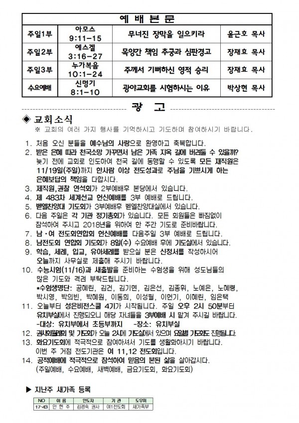 2017년 11월 5일 예배본문 & 교회소식 페이지 정보 작성자 최고관리자 작성일17-11-03 18:18 조회8,582회 관련링크 이전글 다음글 목록 본문 2017년 11월 5일 예배본문 & 교회소식 이전글 다음글 목록