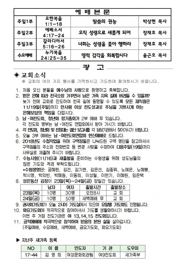 2017년 11월 12일 예배본문 & 교회소식 페이지 정보 작성자 최고관리자 작성일17-11-10 17:54 조회8,560회 관련링크 이전글 다음글 목록 본문 2017년 11월 12일 예배본문 & 교회소식 이전글 다음글 목록