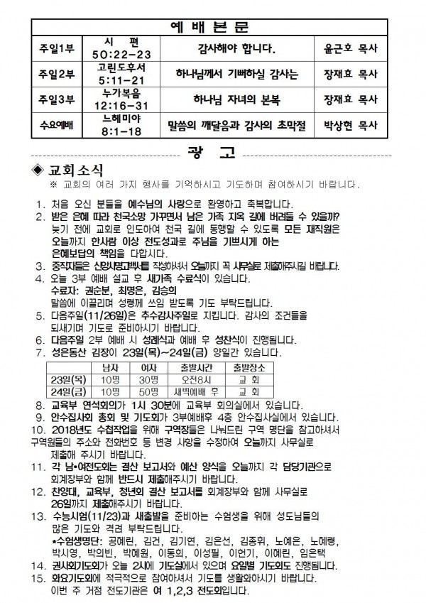 2017년 11월 19일 예배본문 & 교회소식 페이지 정보 작성자 최고관리자 작성일17-11-17 18:09 조회8,611회 관련링크 이전글 다음글 목록 본문 2017년 11월 19일 예배본문 & 교회소식 이전글 다음글 목록
