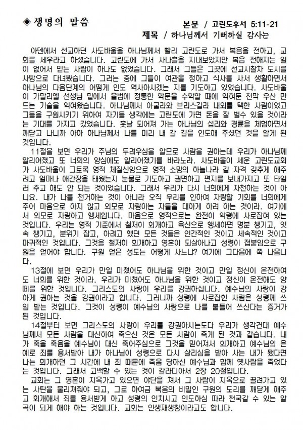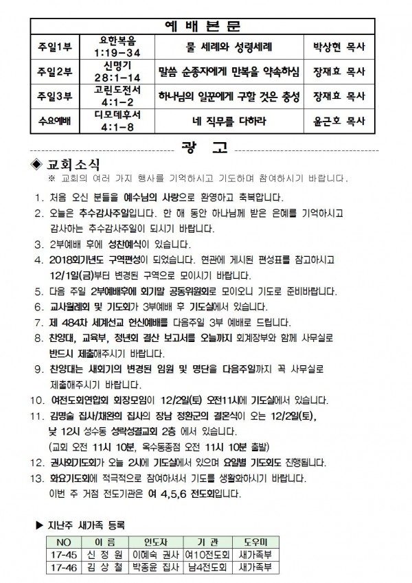 2017년 11월 26일 예배본문 & 교회소식 페이지 정보 작성자 최고관리자 작성일17-11-24 17:40 조회8,543회 관련링크 이전글 다음글 목록 본문 2017년 11월 26일 예배본문 & 교회소식 이전글 다음글 목록