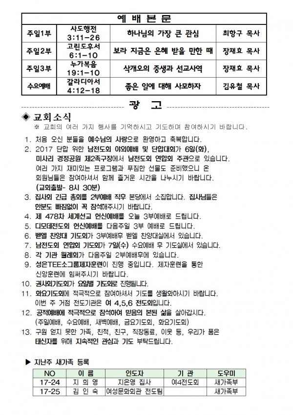 2017년 6월 4일 예배본문 & 교회소식 페이지 정보 작성자 최고관리자 작성일17-06-02 16:26 조회10,505회 관련링크 이전글 다음글 목록 본문 2017년 6월 4일 예배본문 & 교회소식 이전글 다음글 목록