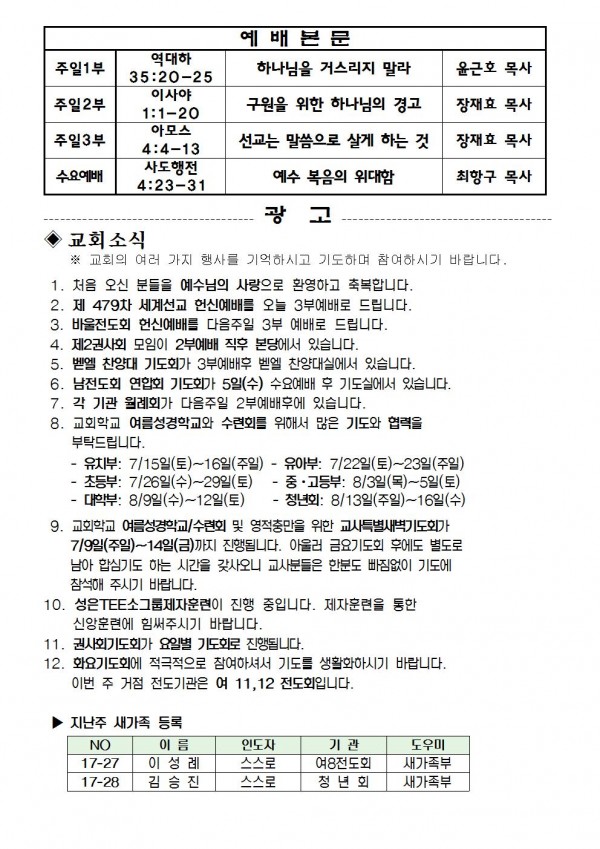 2017년 7월 2일 예배본문 & 교회소식 페이지 정보 작성자 최고관리자 작성일17-06-30 16:33 조회9,966회 관련링크 이전글 다음글 목록 본문 2017년 7월 2일 예배본문 & 교회소식 이전글 다음글 목록