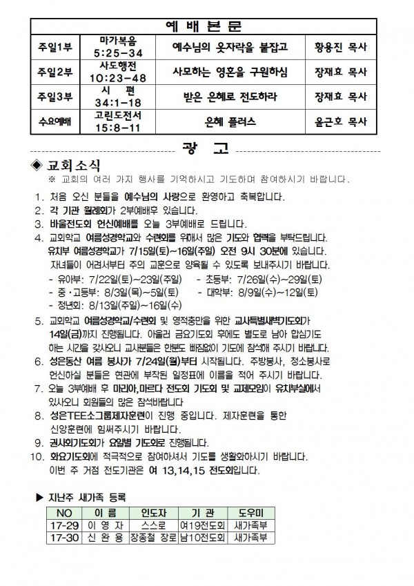 2017년 7월 9일 예배본문 & 교회소식 페이지 정보 작성자 최고관리자 작성일17-07-07 14:32 조회10,066회 관련링크 이전글 다음글 목록 본문 2017년 7월 9일 예배본문 & 교회소식 이전글 다음글 목록