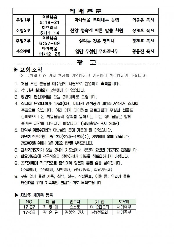 2017년 8월 13일 예배본문 & 교회소식 페이지 정보 작성자 최고관리자 작성일17-08-11 16:16 조회9,585회 관련링크 이전글 다음글 목록 본문 2017년 8월 13일 예배본문 & 교회소식 이전글 다음글 목록