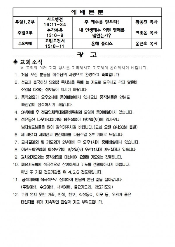 2017년 8월 27일 예배본문 & 교회소식 페이지 정보 작성자 최고관리자 작성일17-08-25 15:21 조회9,651회 관련링크 이전글 다음글 목록 본문 2017년 8월 27일 예배본문 & 교회소식 이전글 다음글 목록