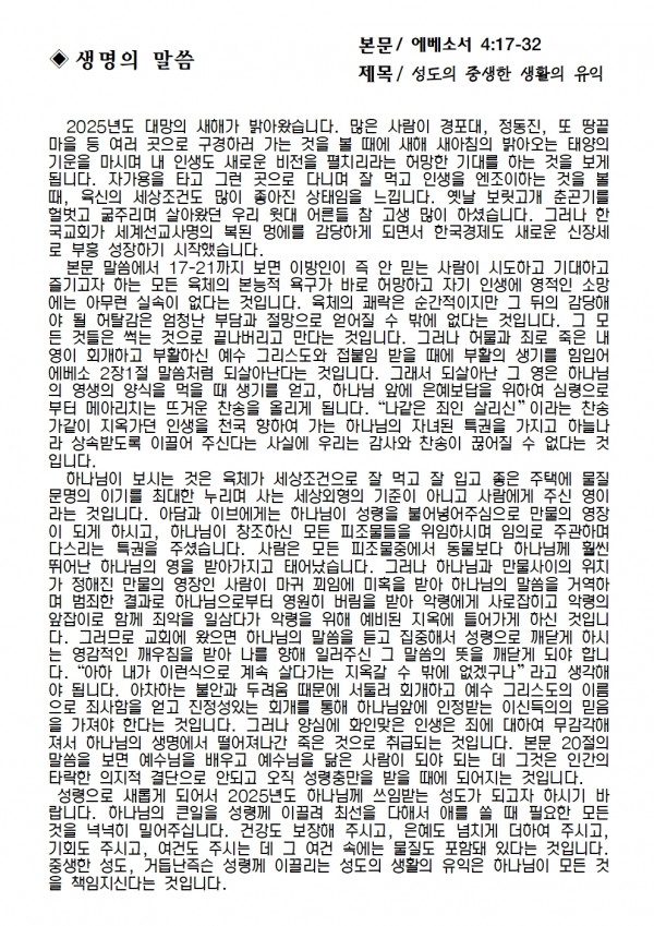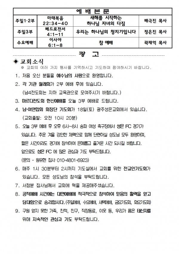 2025년 1월 12일 예배본문 & 교회소식 페이지 정보 작성자 성은교회 작성일25-01-10 16:19 조회3,513회 관련링크 이전글 다음글 목록 본문 2025년 1월 12일 예배본문 & 교회소식 이전글 다음글 목록