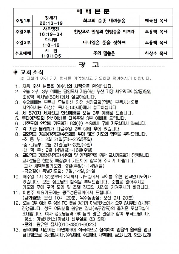 2025년 2월 2일 예배본문 & 교회소식 페이지 정보 작성자 성은교회 작성일25-01-31 15:42 조회3,370회 관련링크 이전글 다음글 목록 본문 2025년 2월 2일 예배본문 & 교회소식 이전글 다음글 목록