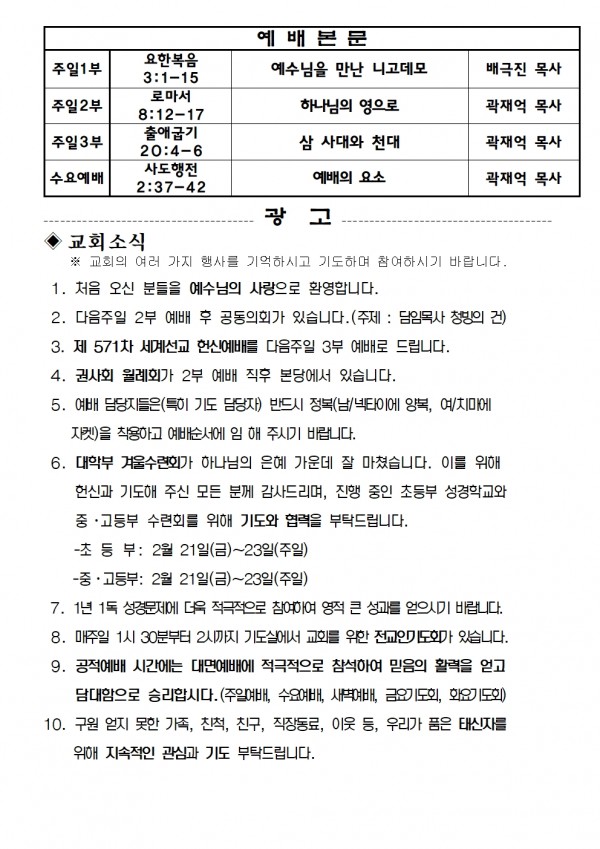 2025년 2월 23일 예배본문 & 교회소식 페이지 정보 작성자 성은교회 작성일25-02-21 16:53 조회3,376회 관련링크 이전글 다음글 목록 본문 2025년 2월 23일 예배본문 & 교회소식 이전글 다음글 목록