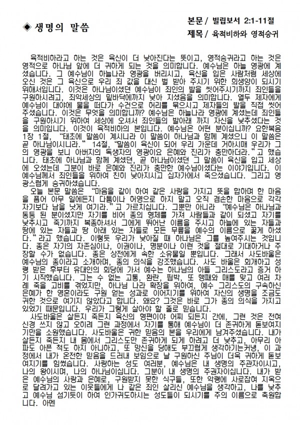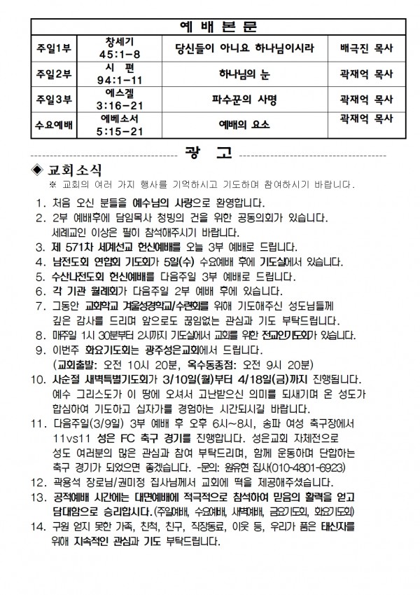 2025년 3월 2일 예배본문 & 교회소식 페이지 정보 작성자 성은교회 작성일25-02-28 12:37 조회3,297회 관련링크 이전글 다음글 목록 본문 2025년 3월 2일 예배본문 & 교회소식 이전글 다음글 목록