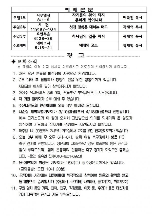 2025년 3월 9일 예배본문 & 교회소식 페이지 정보 작성자 성은교회 작성일25-03-07 16:38 조회3,097회 관련링크 이전글 다음글 목록 본문 2025년 3월 9일 예배본문 & 교회소식 이전글 다음글 목록