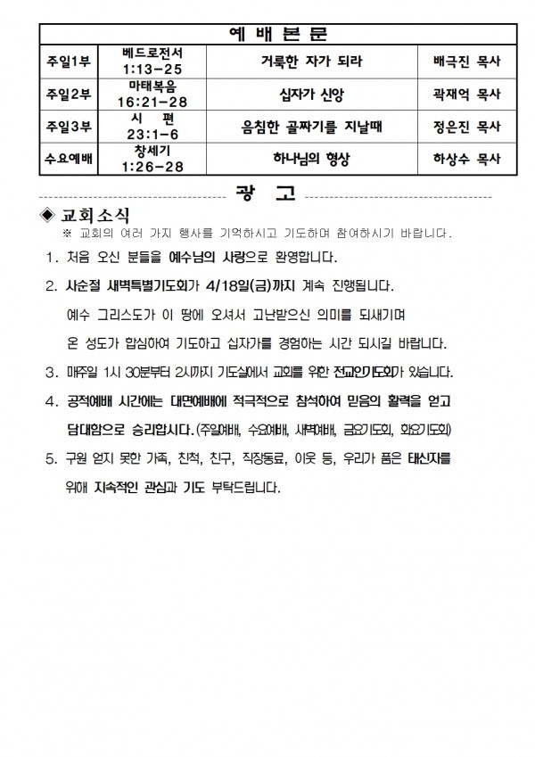 2025년 3월 16일 예배본문 & 교회소식 페이지 정보 작성자 성은교회 작성일25-03-14 17:02 조회3,083회 관련링크 이전글 다음글 목록 본문 2025년 3월 16일 예배본문 & 교회소식 이전글 다음글 목록