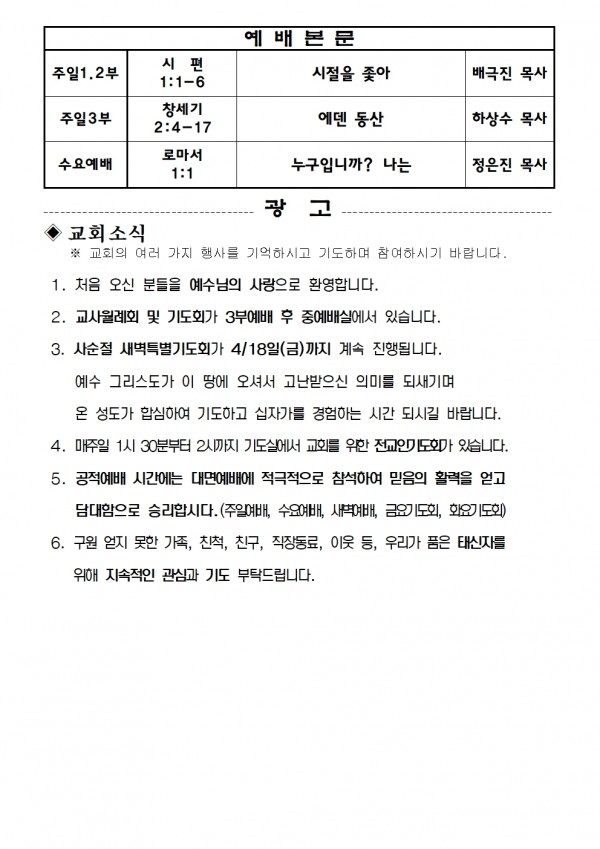 2025년 3월 23일 예배본문 & 교회소식 페이지 정보 작성자 성은교회 작성일25-03-21 16:43 조회3,025회 관련링크 이전글 다음글 목록 본문 2025년 3월 23일 예배본문 & 교회소식 이전글 다음글 목록