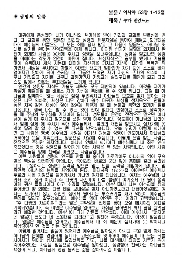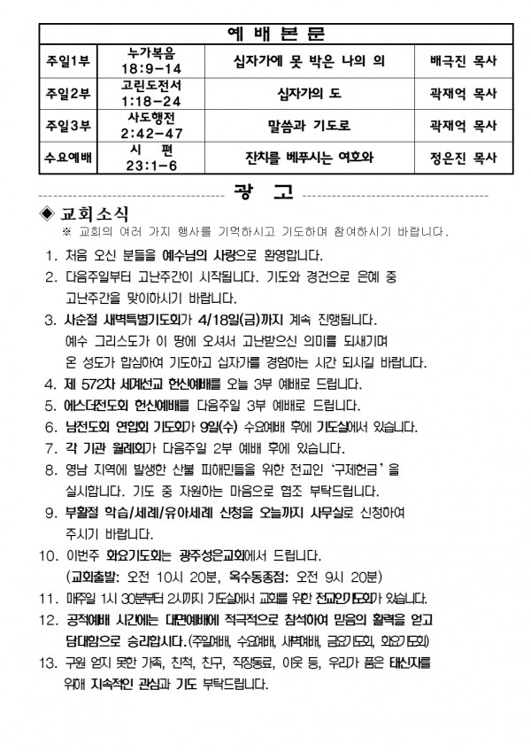 2025년 4월 6일 예배본문 & 교회소식 페이지 정보 작성자 성은교회 작성일25-04-04 15:11 조회2,867회 관련링크 이전글 다음글 목록 본문 2025년 4월 6일 예배본문 & 교회소식 이전글 다음글 목록