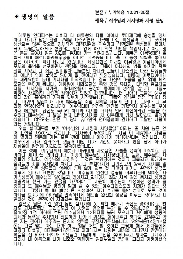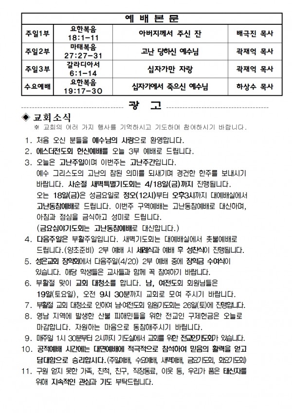 2025년 4월 13일 예배본문 & 교회소식 페이지 정보 작성자 성은교회 작성일25-04-11 17:00 조회2,843회 관련링크 이전글 다음글 목록 본문 2025년 4월 13일 예배본문 & 교회소식 이전글 다음글 목록