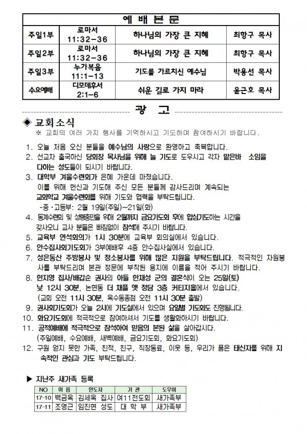 2017년 2월 19일 예배본문 & 교회소식 페이지 정보 작성자 최고관리자 작성일17-02-16 16:28 조회9,443회 관련링크 이전글 다음글 목록 본문 2017년 2월 19일 예배본문 & 교회소식 이전글 다음글 목록