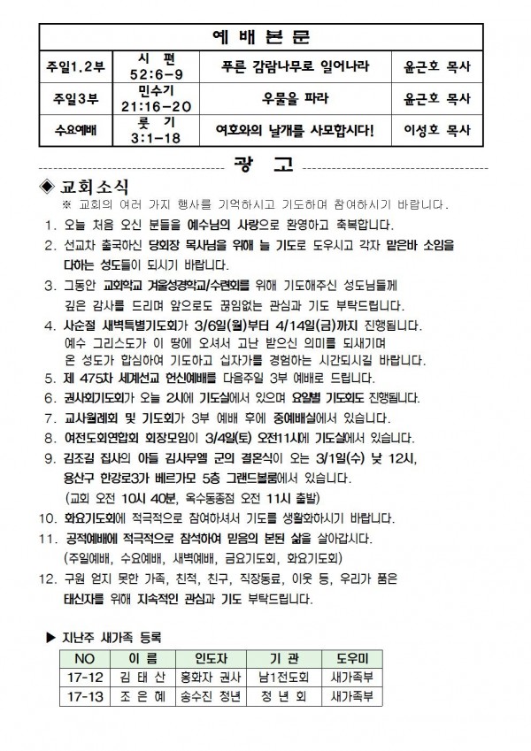 2017년 2월 26일 예배본문 & 교회소식 페이지 정보 작성자 최고관리자 작성일17-02-24 17:33 조회9,537회 관련링크 이전글 다음글 목록 본문 2017년 2월 26일 예배본문 & 교회소식 이전글 다음글 목록