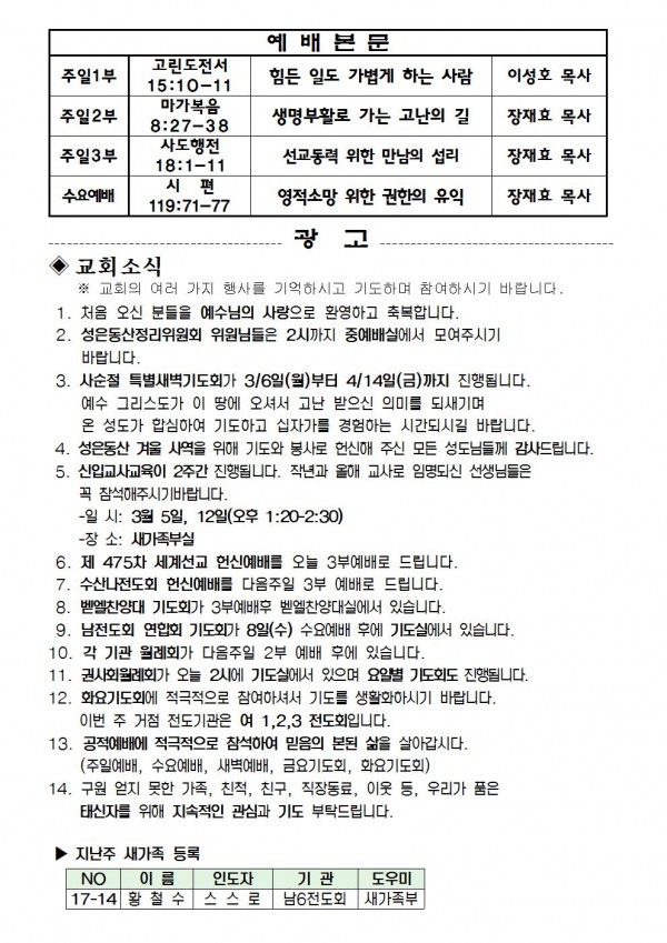 2017년 3월 5일 예배본문 & 교회소식 페이지 정보 작성자 최고관리자 작성일17-03-03 15:44 조회9,334회 관련링크 이전글 다음글 목록 본문 2017년 3월 5일 예배본문 & 교회소식 이전글 다음글 목록