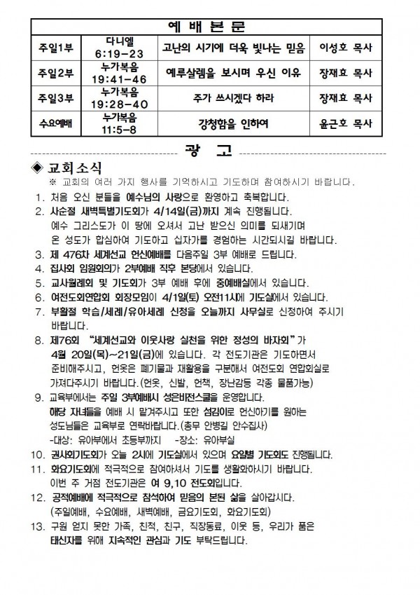 2017년 3월 26일 예배본문 & 교회소식 페이지 정보 작성자 최고관리자 작성일17-03-24 15:41 조회9,499회 관련링크 이전글 다음글 목록 본문 2017년 3월 26일 예배본문 & 교회소식 이전글 다음글 목록