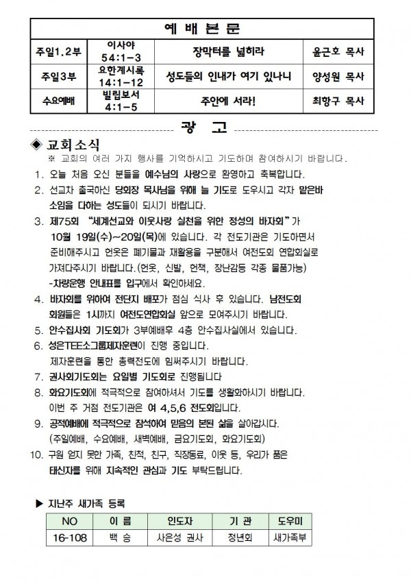 2016년 10월 16일 예배본문 & 교회소식 페이지 정보 작성자 최고관리자 작성일16-10-14 17:15 조회9,396회 관련링크 이전글 다음글 목록 본문 2016년 10월 16일 예배본문 & 교회소식 이전글 다음글 목록