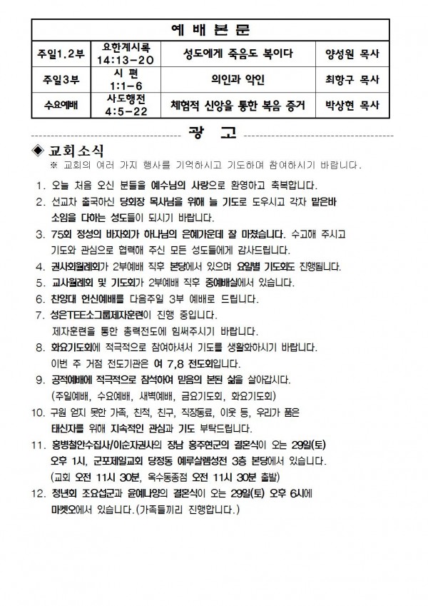 2016년 10월 23일 예배본문 & 교회소식 페이지 정보 작성자 최고관리자 작성일16-10-21 15:34 조회9,337회 관련링크 이전글 다음글 목록 본문 2016년 10월 23일 예배본문 & 교회소식 이전글 다음글 목록