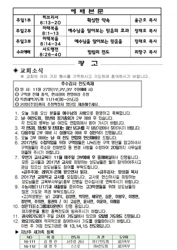 2016년 11월 13일 예배본문 & 교회소식 페이지 정보 작성자 최고관리자 작성일16-11-11 15:57 조회9,336회 관련링크 이전글 다음글 목록 본문 2016년 11월 13일 예배본문 & 교회소식 이전글 다음글 목록