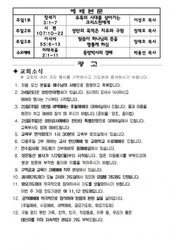 2016년 12월 18일 예배본문 & 교회소식 페이지 정보 작성자 최고관리자 작성일16-12-16 18:56 조회9,232회 관련링크 이전글 다음글 목록 본문 2016년 12월 18일 예배본문 & 교회소식 이전글 다음글 목록