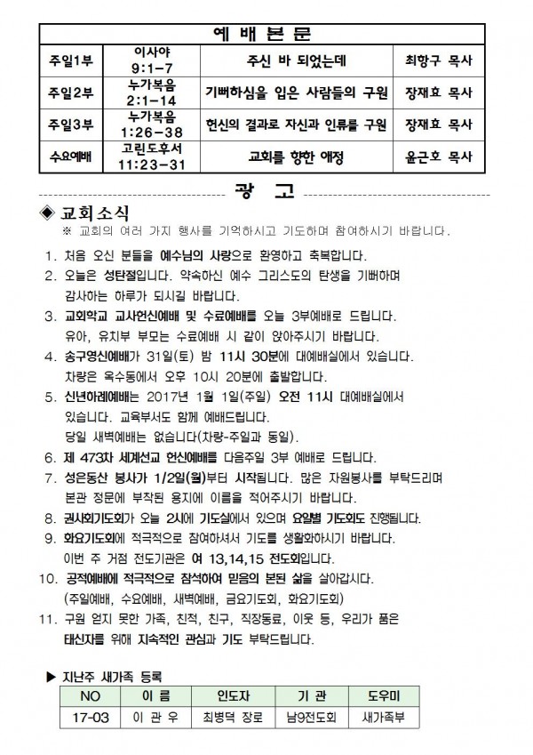 2016년 12월 25일 예배본문 & 교회소식 페이지 정보 작성자 최고관리자 작성일16-12-23 17:40 조회9,222회 관련링크 이전글 다음글 목록 본문 2016년 12월 25일 예배본문 & 교회소식 이전글 다음글 목록