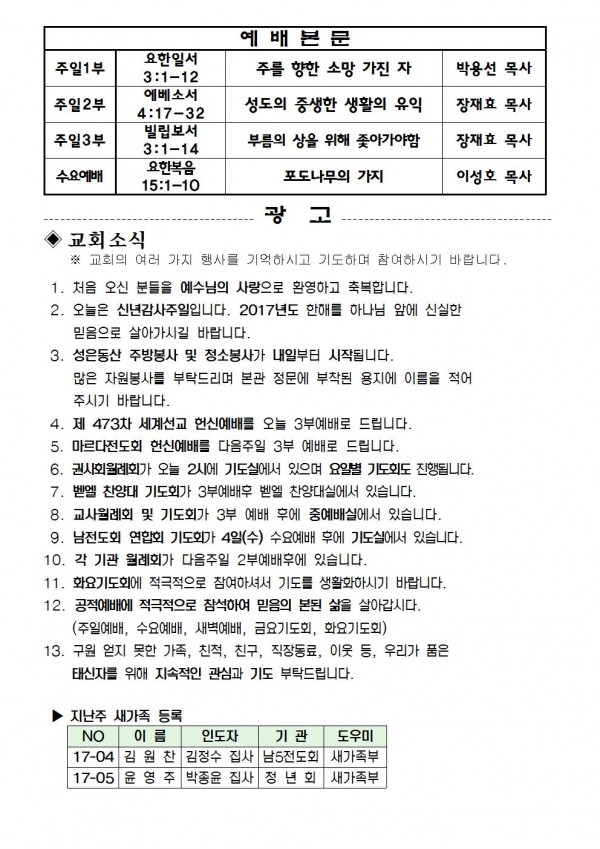 2017년 1월 1일 예배본문 & 교회소식 페이지 정보 작성자 최고관리자 작성일16-12-30 16:33 조회9,164회 관련링크 이전글 다음글 목록 본문 2017년 1월 1일 예배본문 & 교회소식 이전글 다음글 목록