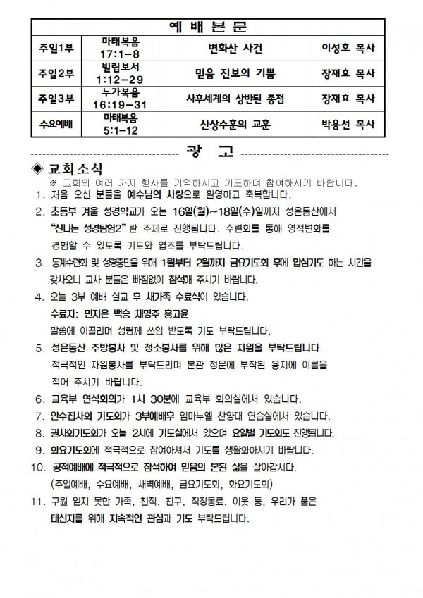 2017년 1월 15일 예배본문 & 교회소식 페이지 정보 작성자 최고관리자 작성일17-01-13 17:47 조회9,185회 관련링크 이전글 다음글 목록 본문 2017년 1월 15일 예배본문 & 교회소식 이전글 다음글 목록