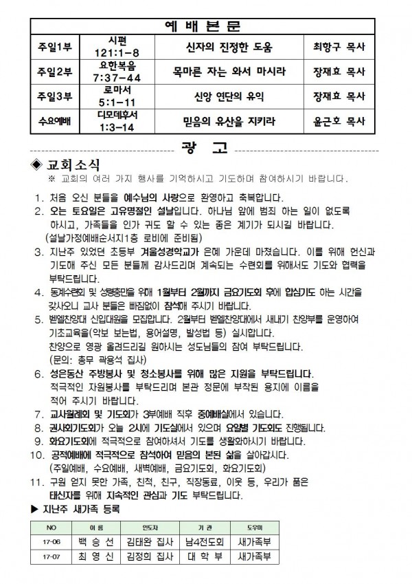 2017년 1월 22일 예배본문 & 교회소식 페이지 정보 작성자 최고관리자 작성일17-01-20 17:14 조회9,174회 관련링크 이전글 다음글 목록 본문 2017년 1월 22일 예배본문 & 교회소식 이전글 다음글 목록