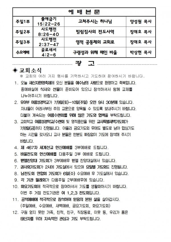 2016년 7월 3일 예배본문 & 교회소식 페이지 정보 작성자 최고관리자 작성일16-07-01 17:57 조회9,451회 관련링크 이전글 다음글 목록 본문 2016년 7월 3일 예배본문 & 교회소식 이전글 다음글 목록