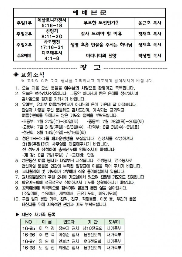 2016년 7월 24일 예배본문 & 교회소식 페이지 정보 작성자 최고관리자 작성일16-07-22 15:03 조회9,563회 관련링크 이전글 다음글 목록 본문 2016년 7월 24일 예배본문 & 교회소식 이전글 다음글 목록