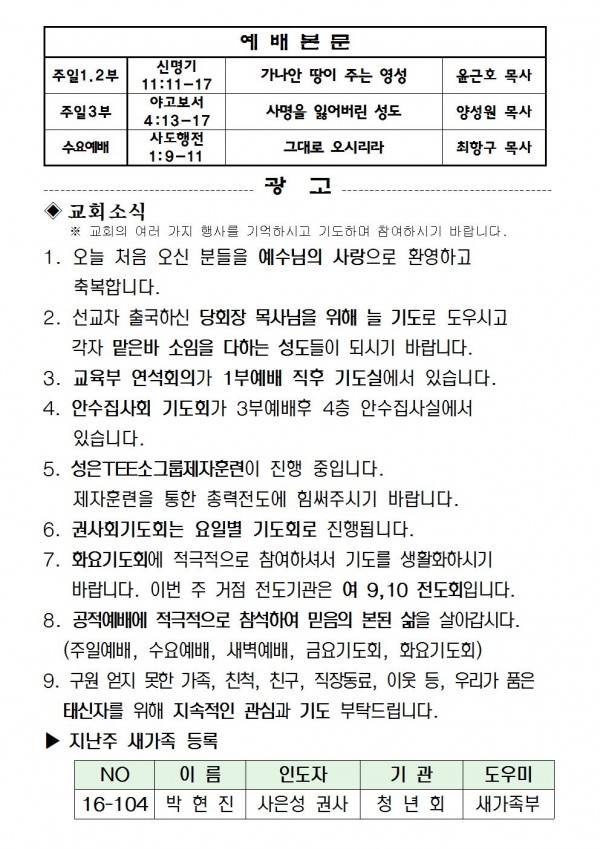 2016년 9월 18일 예배본문 & 교회소식 페이지 정보 작성자 최고관리자 작성일16-09-13 17:20 조회9,485회 관련링크 이전글 다음글 목록 본문 2016년 9월 18일 예배본문 & 교회소식 이전글 다음글 목록