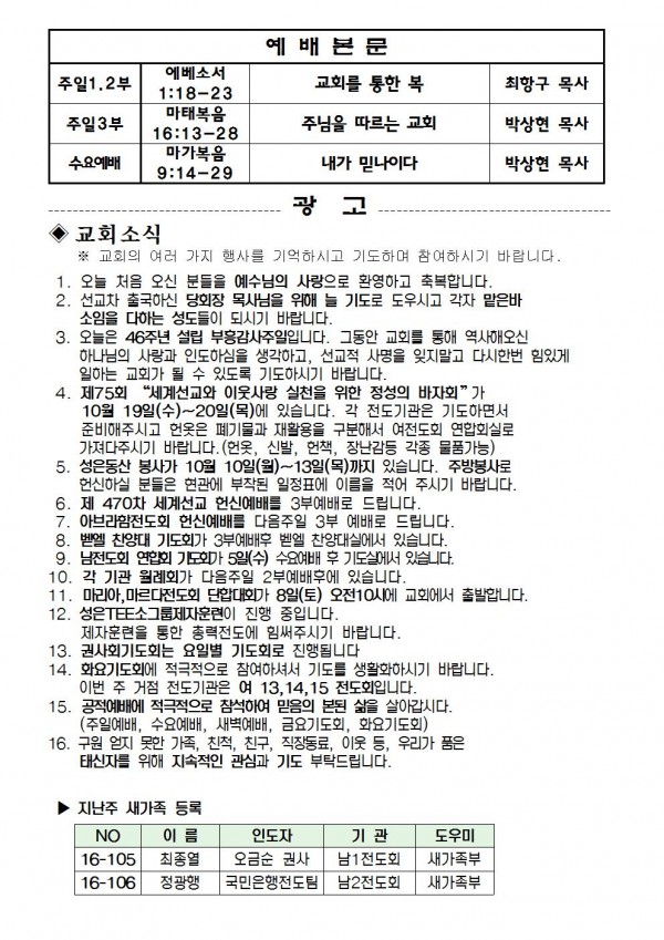 2016년 10월 2일 예배본문 & 교회소식 페이지 정보 작성자 최고관리자 작성일16-09-30 16:57 조회9,422회 관련링크 이전글 다음글 목록 본문 2016년 10월 2일 예배본문 & 교회소식 이전글 다음글 목록