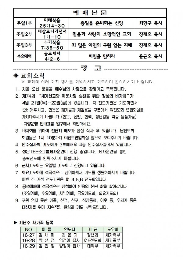 2016년 4월 17일 예배본문 & 교회소식 페이지 정보 작성자 최고관리자 작성일16-04-15 11:52 조회9,654회 관련링크 이전글 다음글 목록 본문 2016년 4월 17일 예배본문 & 교회소식 이전글 다음글 목록