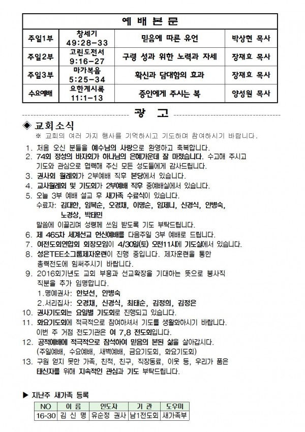 2016년 4월 24일 예배본문 & 교회소식 페이지 정보 작성자 최고관리자 작성일16-04-22 20:09 조회9,622회 관련링크 이전글 다음글 목록 본문 2016년 4월 24일 예배본문 & 교회소식 이전글 다음글 목록