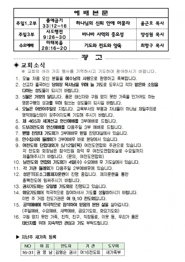 2016년 5월 1일 예배본문 & 교회소식 페이지 정보 작성자 최고관리자 작성일16-04-29 18:34 조회9,570회 관련링크 이전글 다음글 목록 본문 2016년 5월 1일 예배본문 & 교회소식 이전글 다음글 목록