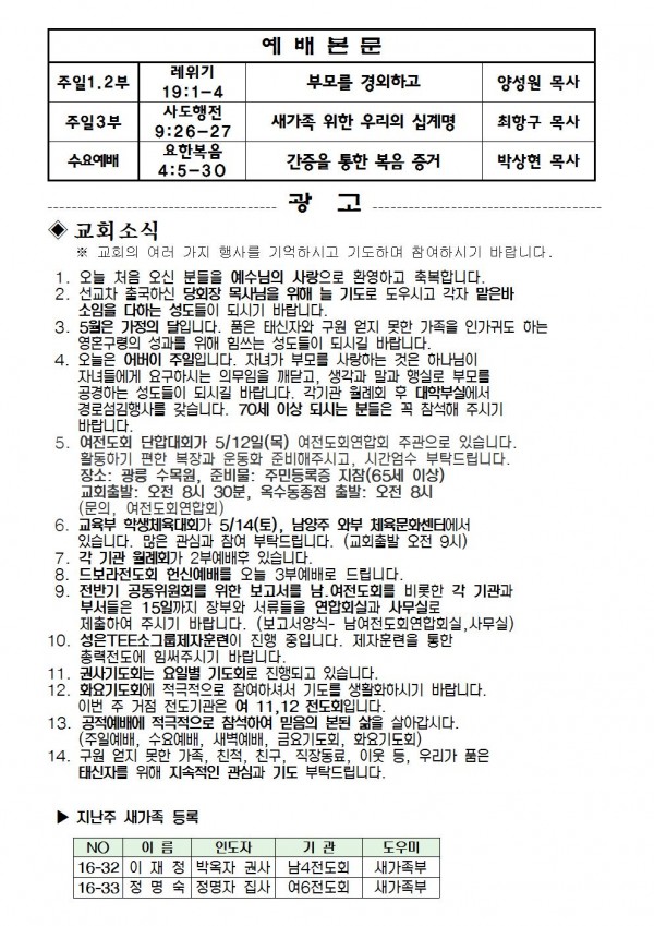 2016년 5월 8일 예배본문 & 교회소식 페이지 정보 작성자 최고관리자 작성일16-05-06 14:38 조회9,502회 관련링크 이전글 다음글 목록 본문 2016년 5월 8일 예배본문 & 교회소식 이전글 다음글 목록