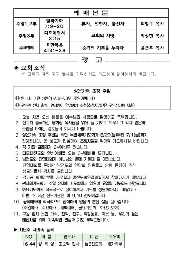 2016년 6월 12일 예배본문 & 교회소식 페이지 정보 작성자 최고관리자 작성일16-06-10 14:45 조회9,385회 관련링크 이전글 다음글 목록 본문 2016년 6월 12일 예배본문 & 교회소식 이전글 다음글 목록