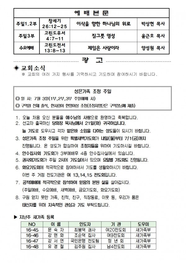 2016년 6월 19일 예배본문 & 교회소식 페이지 정보 작성자 최고관리자 작성일16-06-17 14:49 조회9,316회 관련링크 이전글 다음글 목록 본문 2016년 6월 19일 예배본문 & 교회소식 이전글 다음글 목록
