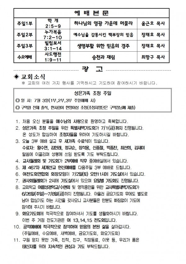 2016년 6월 26일 예배본문 & 교회소식 페이지 정보 작성자 최고관리자 작성일16-06-24 17:38 조회9,402회 관련링크 이전글 다음글 목록 본문 2016년 6월 26일 예배본문 & 교회소식 이전글 다음글 목록