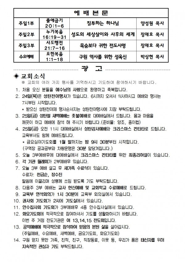 2015년 12월 20일 예배본문 & 교회소식 페이지 정보 작성자 최고관리자 작성일15-12-18 17:08 조회10,507회 관련링크 이전글 다음글 목록 본문 2015년 12월 20일 예배본문 & 교회소식 이전글 다음글 목록